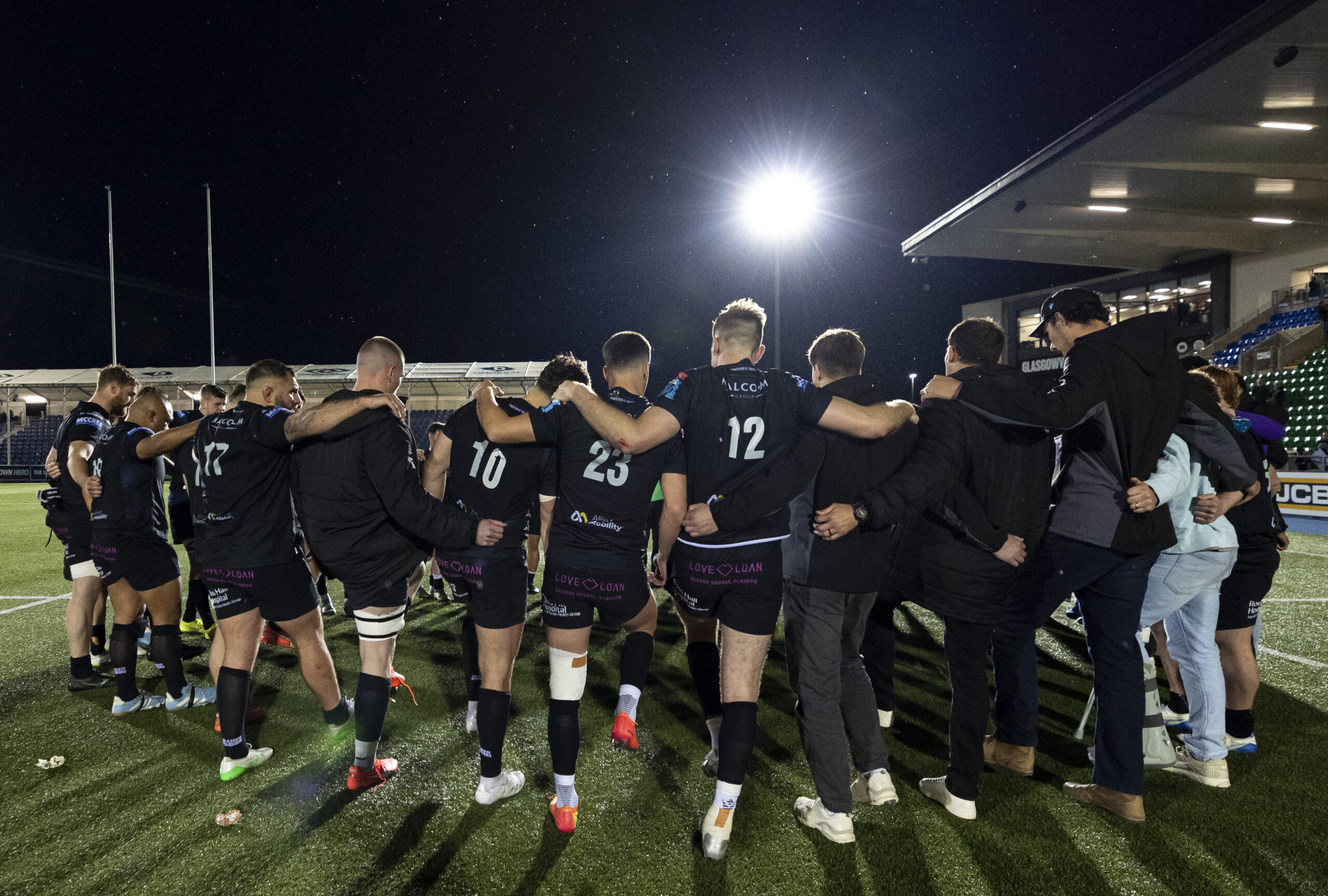 GLASGOW, SCOTLAND - APRIL 25: Warriors huddle at full time during a United Rugby Championship match between Glasgow Warriors and Vodacom Bulls at Scotstoun Stadium, on April 25, 2025, in Glasgow, Scotland. (Photo by Ross MacDonald / SNS Group)