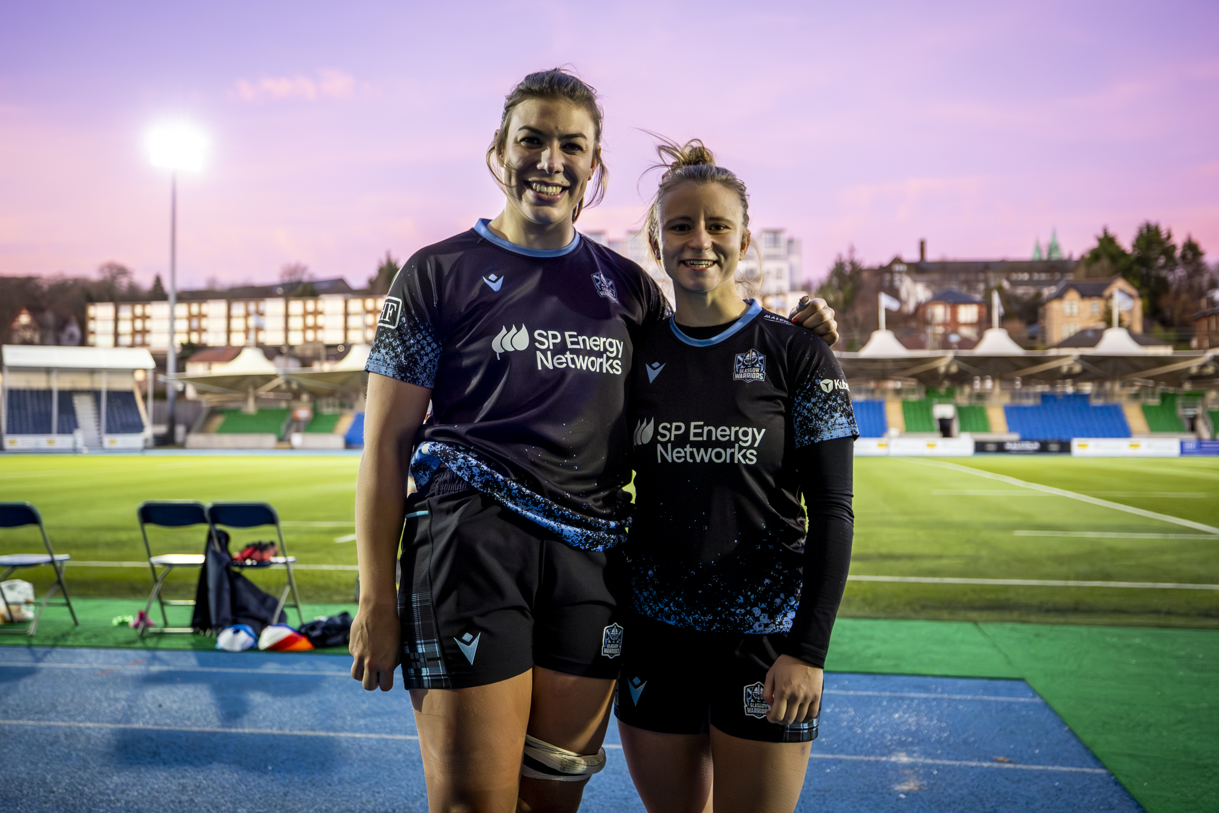 GLASGOW, SCOTLAND - JANUARY 13: Warriors' Louise McMillan (left) and Mairi McDonald at full time during a Celtic Challenge match between Glasgow Warriors and Wolfhounds at Scotstoun Stadium, on January 13, 2024, in Glasgow, Scotland. (Photo by Ewan Bootman / SNS Group)