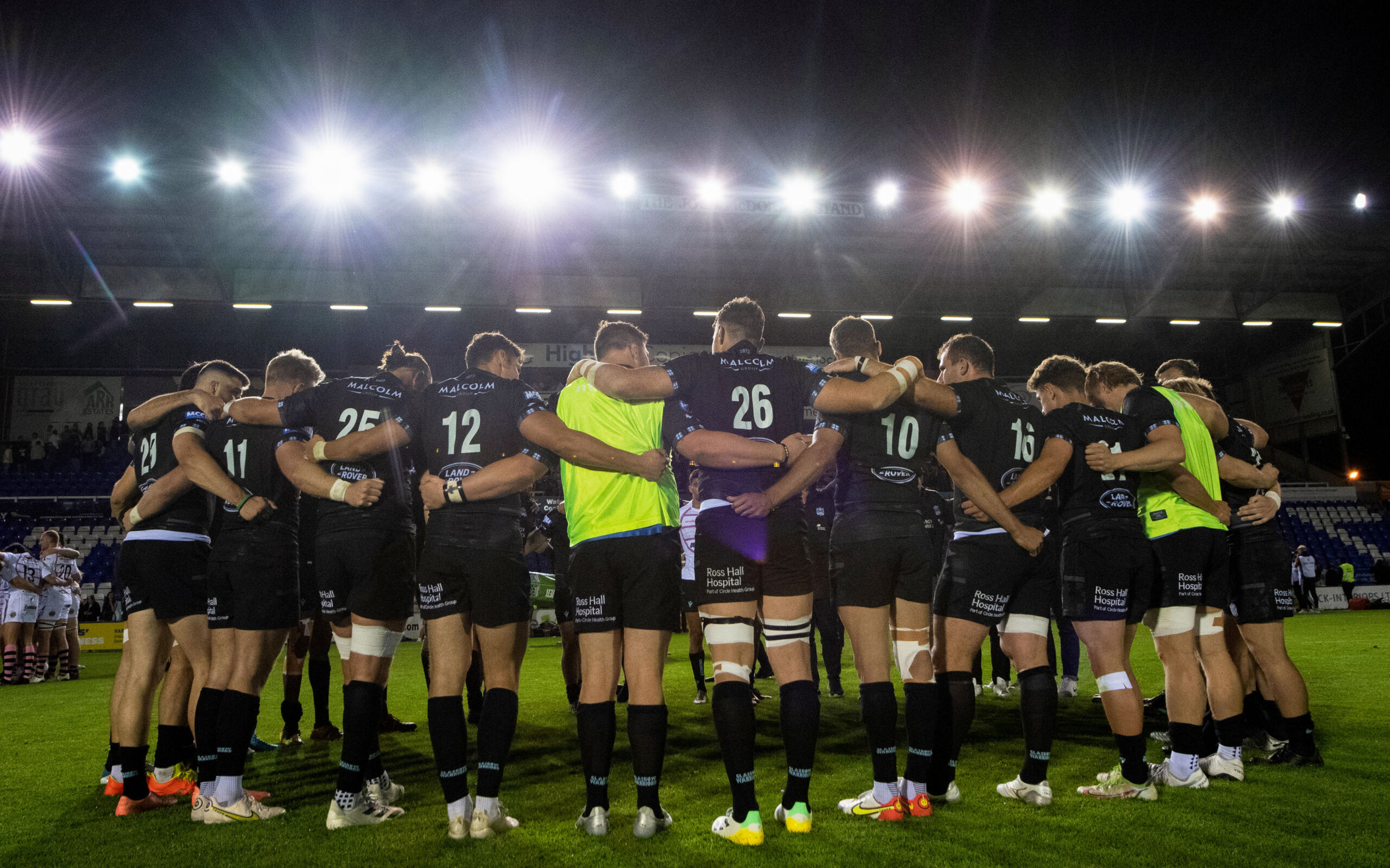 INVERNESS, SCOTLAND - SEPTEMBER 02: Glasgow Warriors players huddle at full time during a pre-season friendly match between Glasgow Warriors and Ayrshire Bulls at the Caldonian Stadium, on September 02, 2022, in Inverness, Scotland. (Photo by Ross MacDonald / SNS Group)