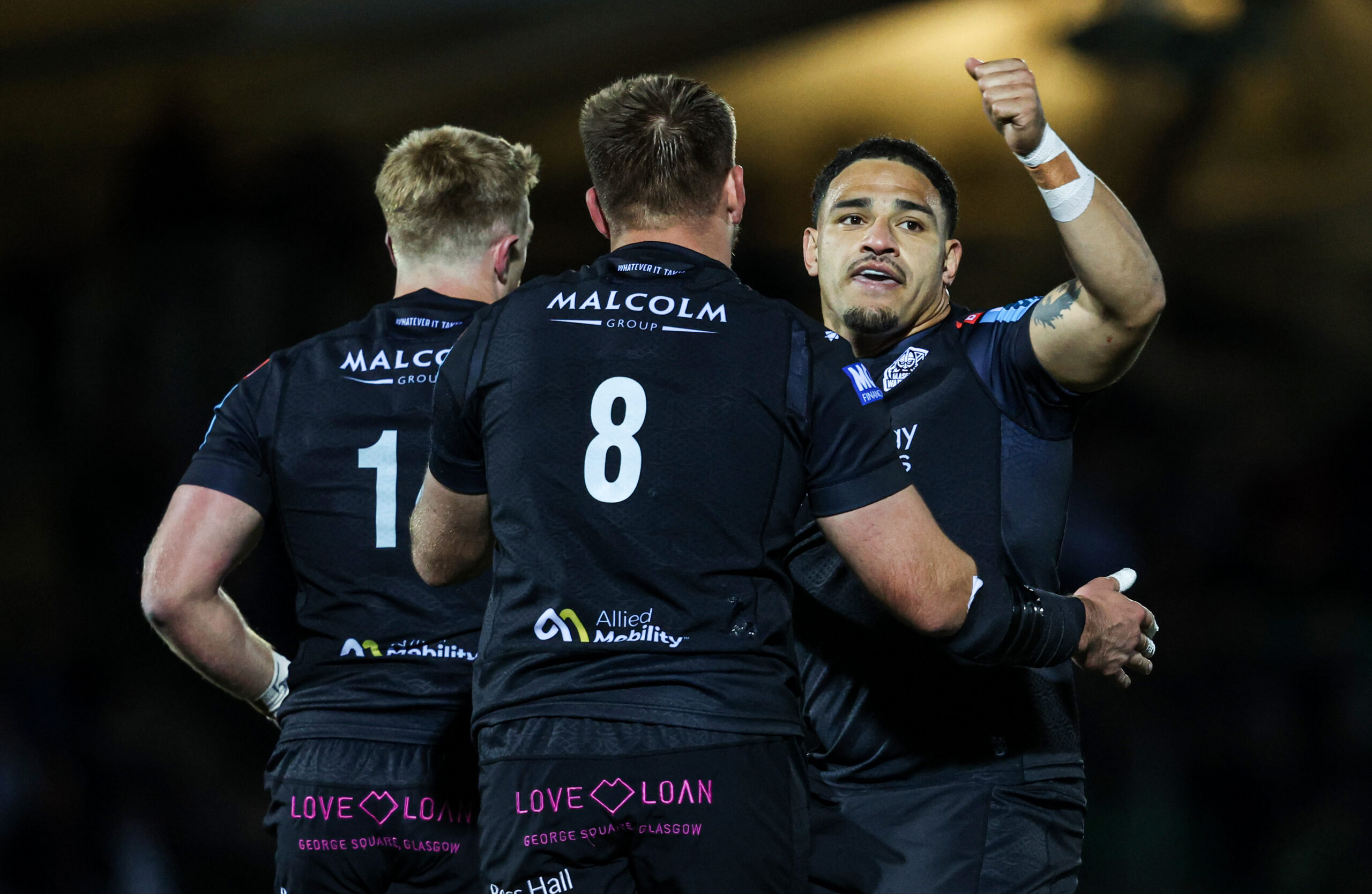 GLASGOW, SCOTLAND - SEPTEMBER 27: Warriors' Matt Fagerson celebrates with Kyle Steyn and Sione Tuipulotu as he scores the second try of the night during a BKT United Rugby Championship match between Glasgow Warriors and Benetton at Scotstoun Stadium, on September 27, 2024, in Glasgow, Scotland. (Photo by Ross MacDonald / SNS Group) With 23 points from a possible 30 to start their BKT United Rugby Championship title defence by sitting second in the standings after the opening block of fixtures, Franco Smith’s men are ideally-placed to build upon their strong start as they kick on into the new calendar year.