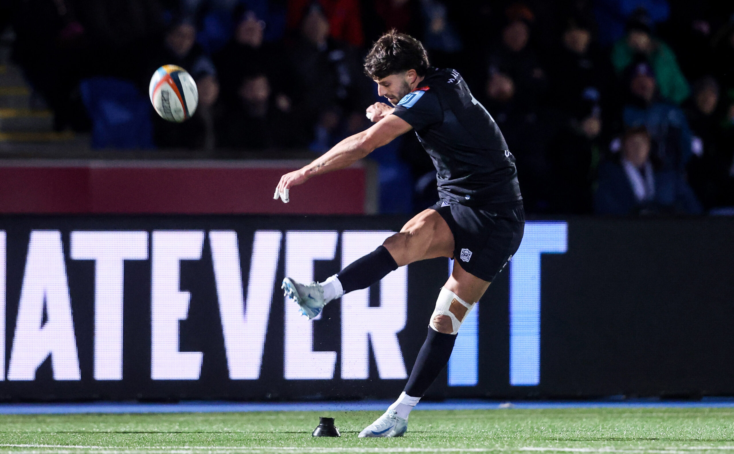 GLASGOW, SCOTLAND - OCTOBER 11: Warriors' Adam Hastings converts after Huw Jones scores a try during a BKT United Rugby Championship match between Glasgow Warriors and Zebre Parma at Scotstoun Stadium, on October 11, 2024, in Glasgow, Scotland. (Photo by Ross MacDonald / SNS Group)