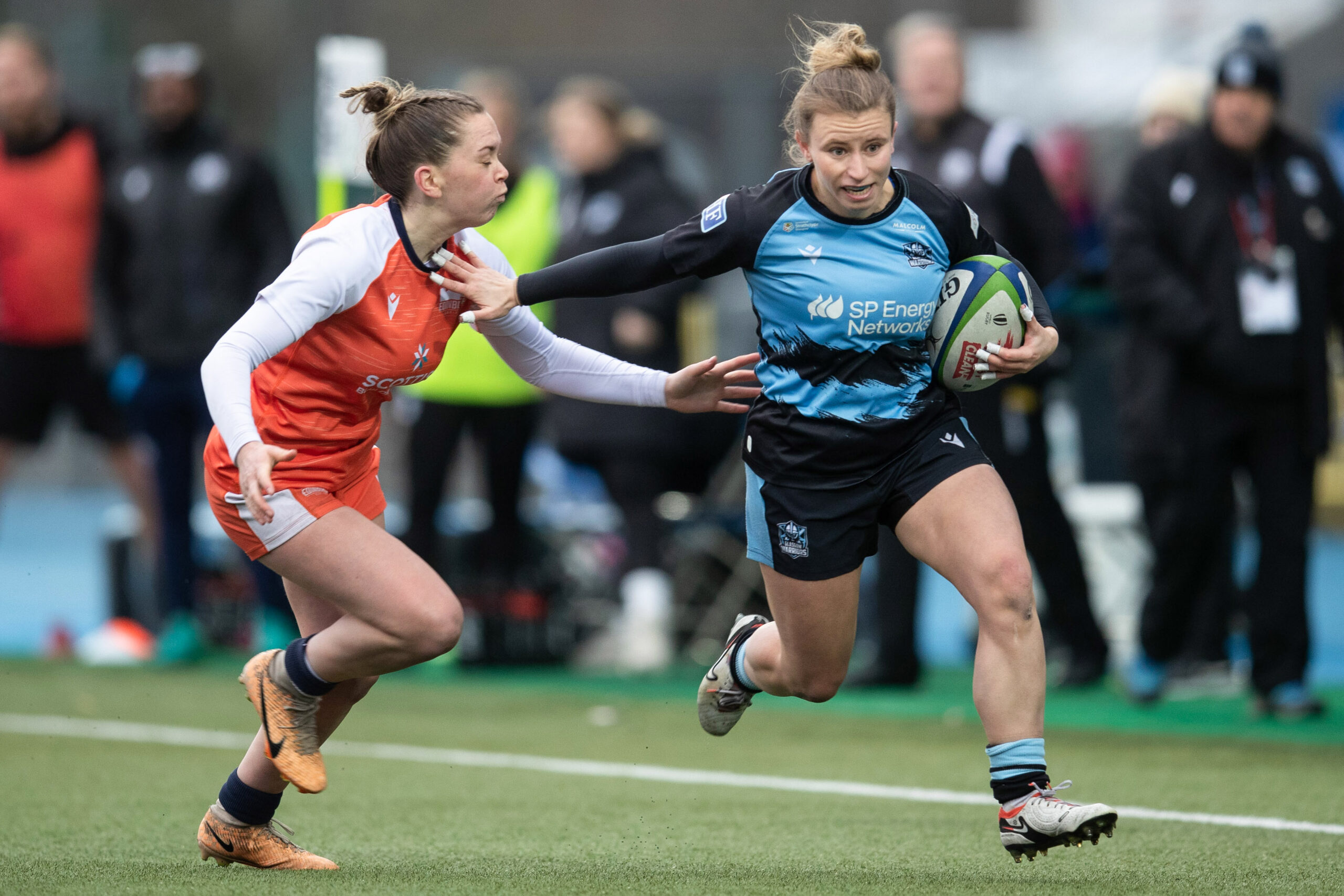 GLASGOW, SCOTLAND - FEBRUARY 15: Glasgow's Mairi McDonald (R) in action during a Celtic Challenge Cup match between Glasgow Warriors and Edinburgh Rugby at Scotstoun Stadium, on February 15, 2025, in Glasgow, Scotland. (Photo by Calum Chittleburgh / SNS Group) Edinburgh kicked off and maintained possession until a penalty allowed Glasgow to kick to ball into touch. Despite a missed opportunity at the line out, Glasgow worked hard and were able to regain possession and force Edinburgh back downfield.
