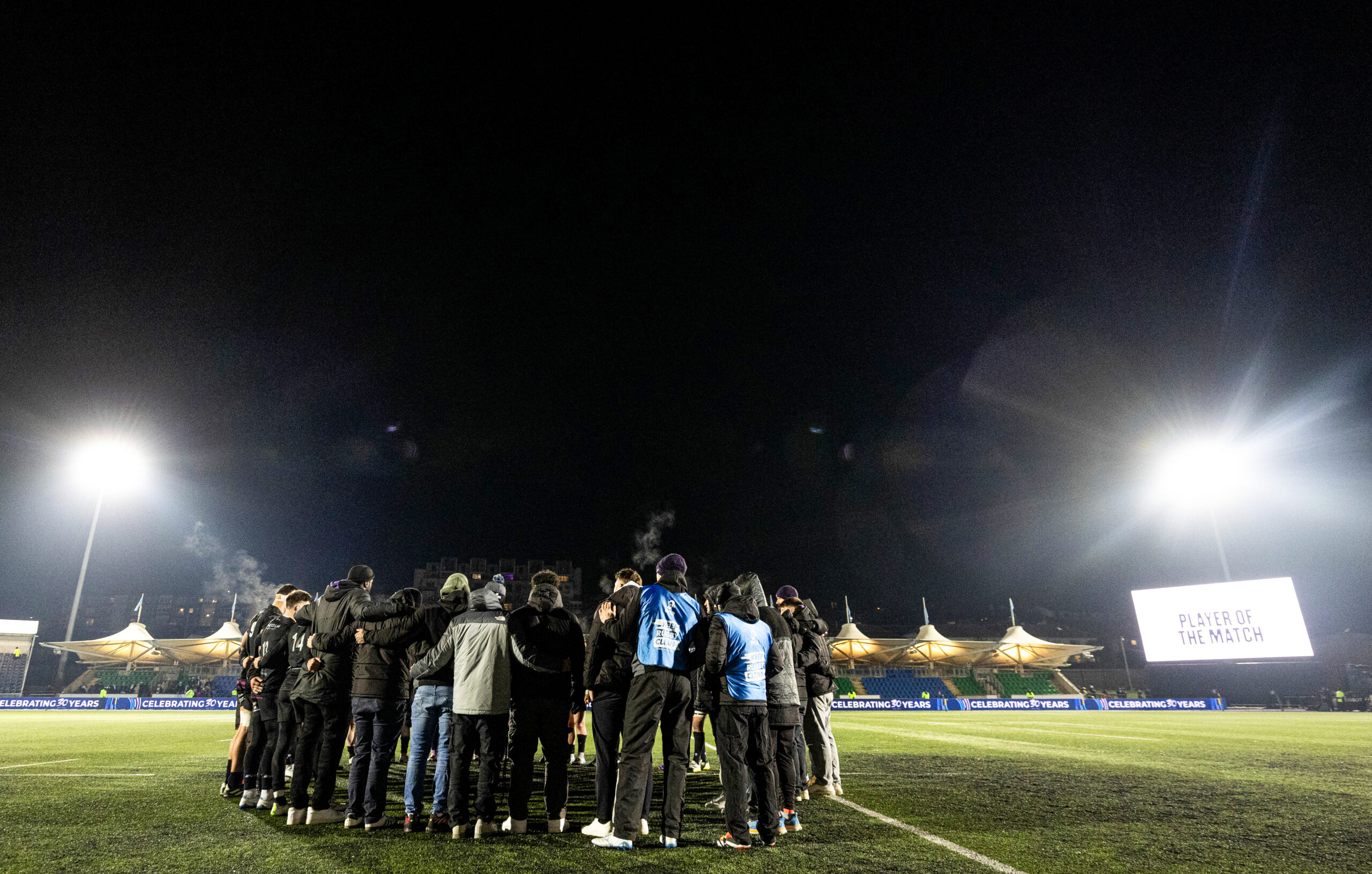 GLASGOW, SCOTLAND - JANUARY 10: The Warriors squad huddle together at full time during an Investec Champions Cup match between Glasgow Warriors and Racing 92 at Scotstoun Stadium, on January 10, 2025, in Glasgow, Scotland. (Photo by Ross MacDonald / SNS Group) Rory Darge was in the middle of the pack up front, and he spoke to glasgowwarriors.org after the match to share his thoughts.
