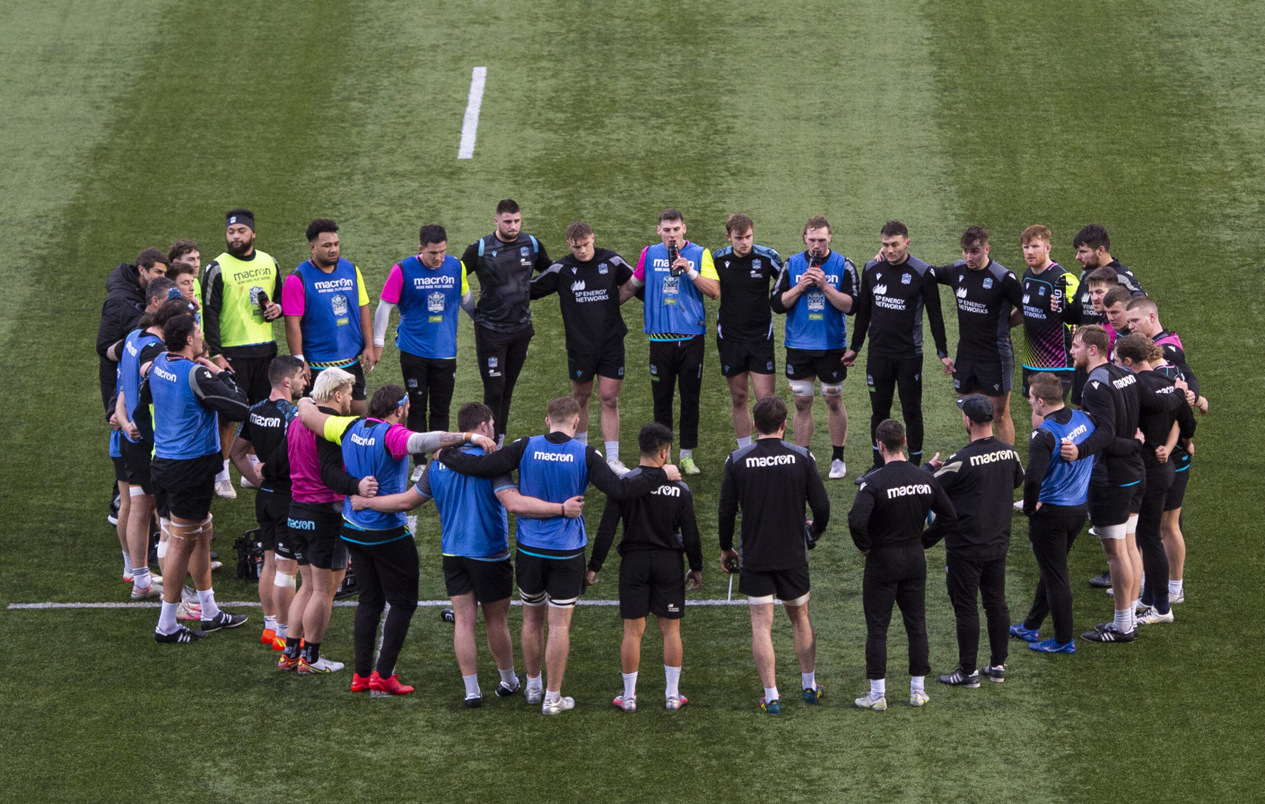 GLASGOW, SCOTLAND - JANUARY 23: Team Huddle during a Glasgow Warriors Training Session at Scotstoun Stadium, on January 23, 2023, in Glasgow, Scotland. (Photo by Ross MacDonald / SNS Group)