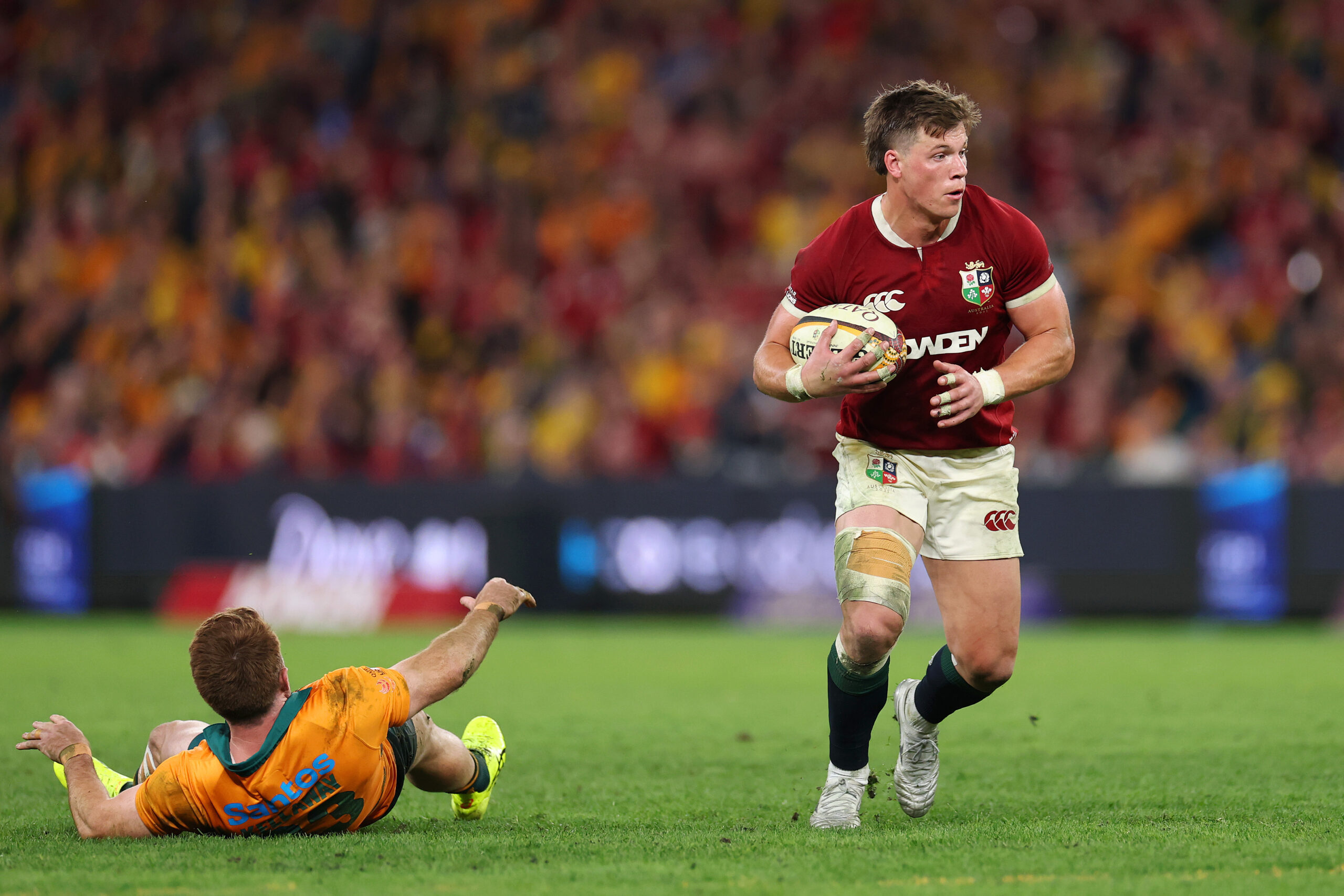 BRISBANE, AUSTRALIA - JULY 19: Huw Jones of the British and Irish Lions runs with the ball during game one of the series between Australia Wallabies and British & Irish Lions at Suncorp Stadium on July 19, 2025 in Brisbane, Australia. (Photo by Cameron Spencer/Getty Images)