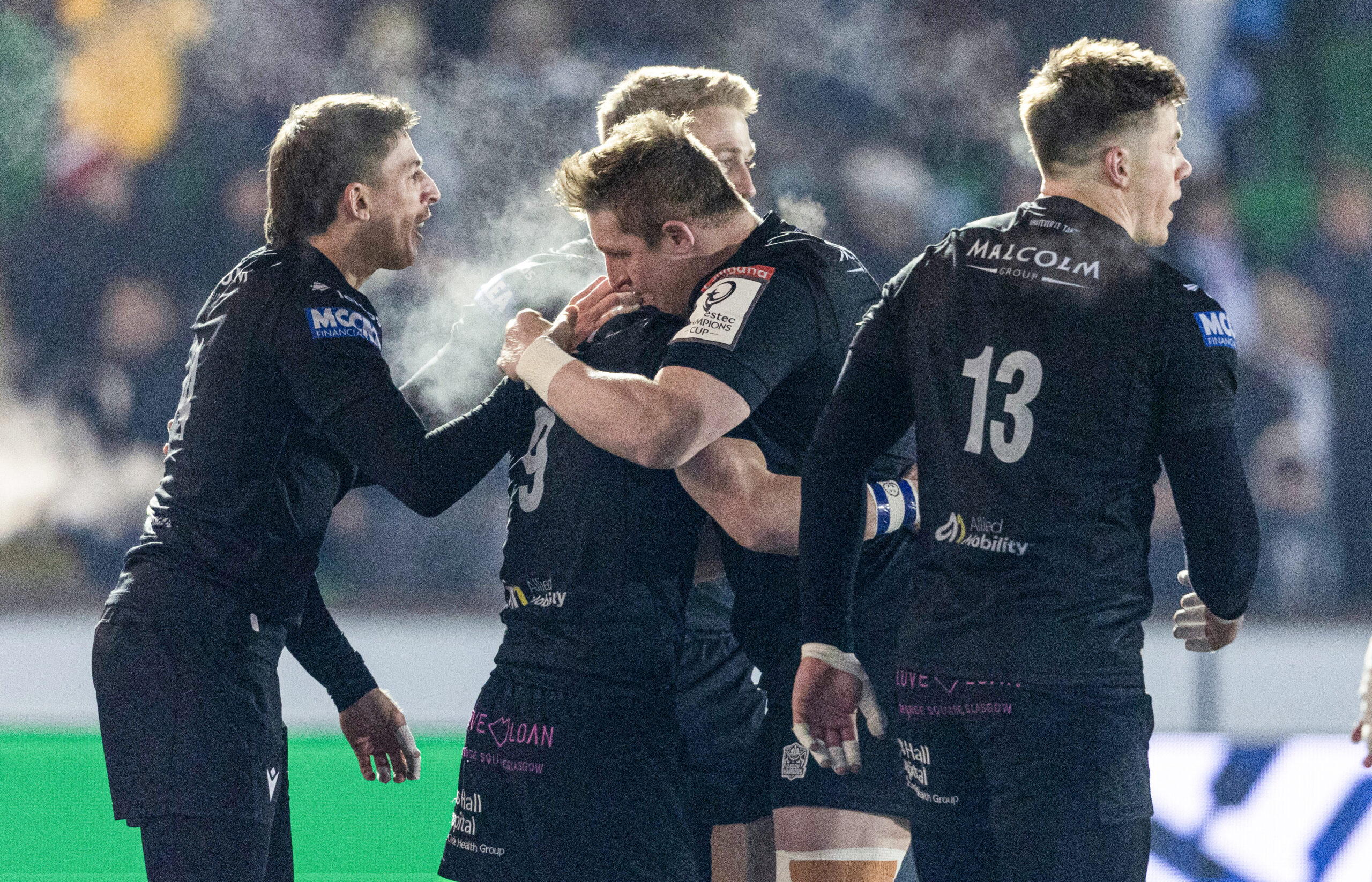 GLASGOW, SCOTLAND - JANUARY 10: Warriors' George Horne celebrates with Johnny Matthews as he scores the opening try during an Investec Champions Cup match between Glasgow Warriors and Racing 92 at Scotstoun Stadium, on January 10, 2025, in Glasgow, Scotland. (Photo by Ross MacDonald / SNS Group) Click here to read more.