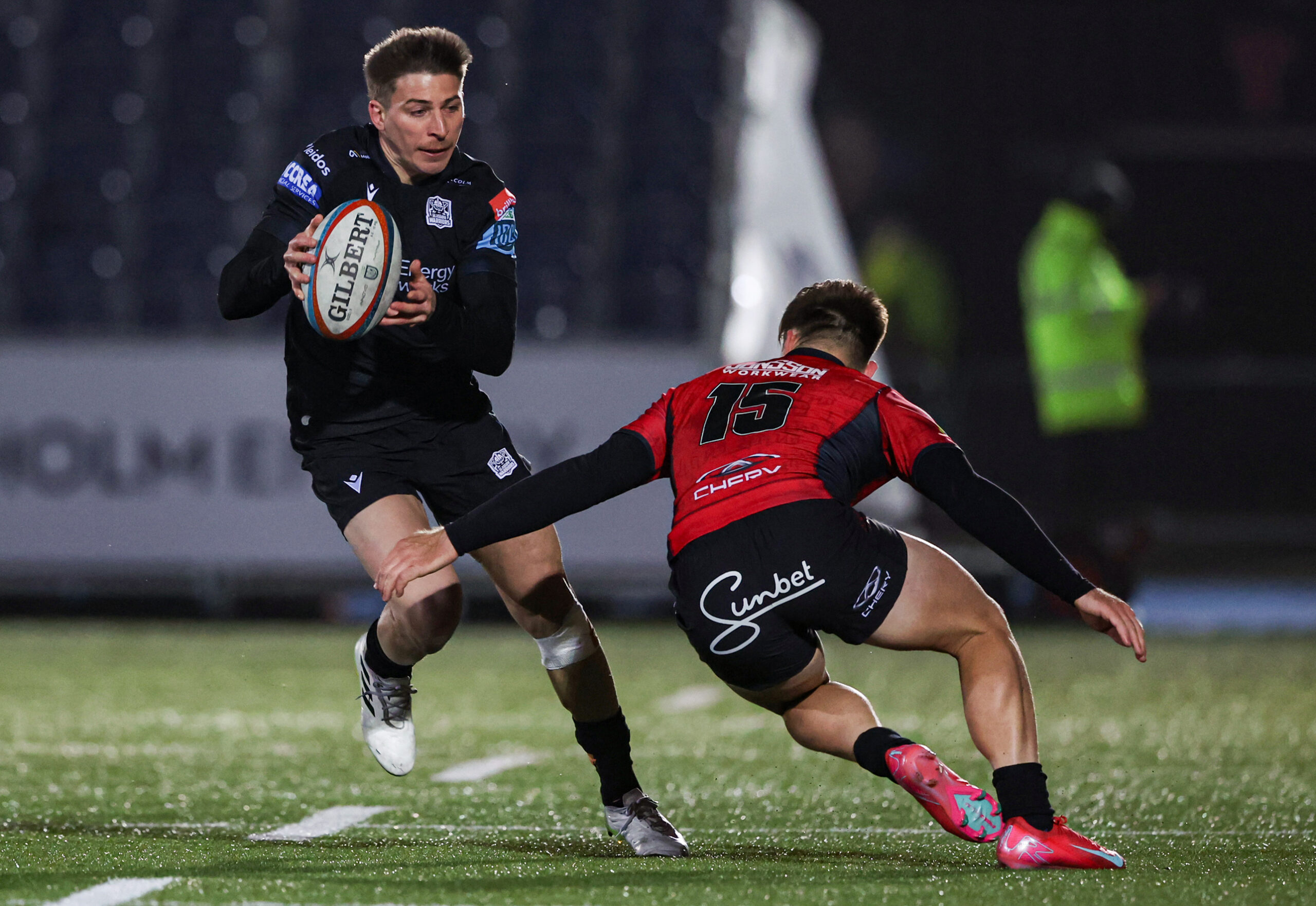 GLASGOW, SCOTLAND - MARCH 29: Warriors' Sebastian Cancelliere (L) and Lions' Quan Horn in action in action during a BKT United Rugby Championship match between Glasgow Warriors and Emirates Lions at Scotstoun Stadium, on March 29, 2025, in Glasgow, Scotland. (Photo by Craig Williamson / SNS Group)