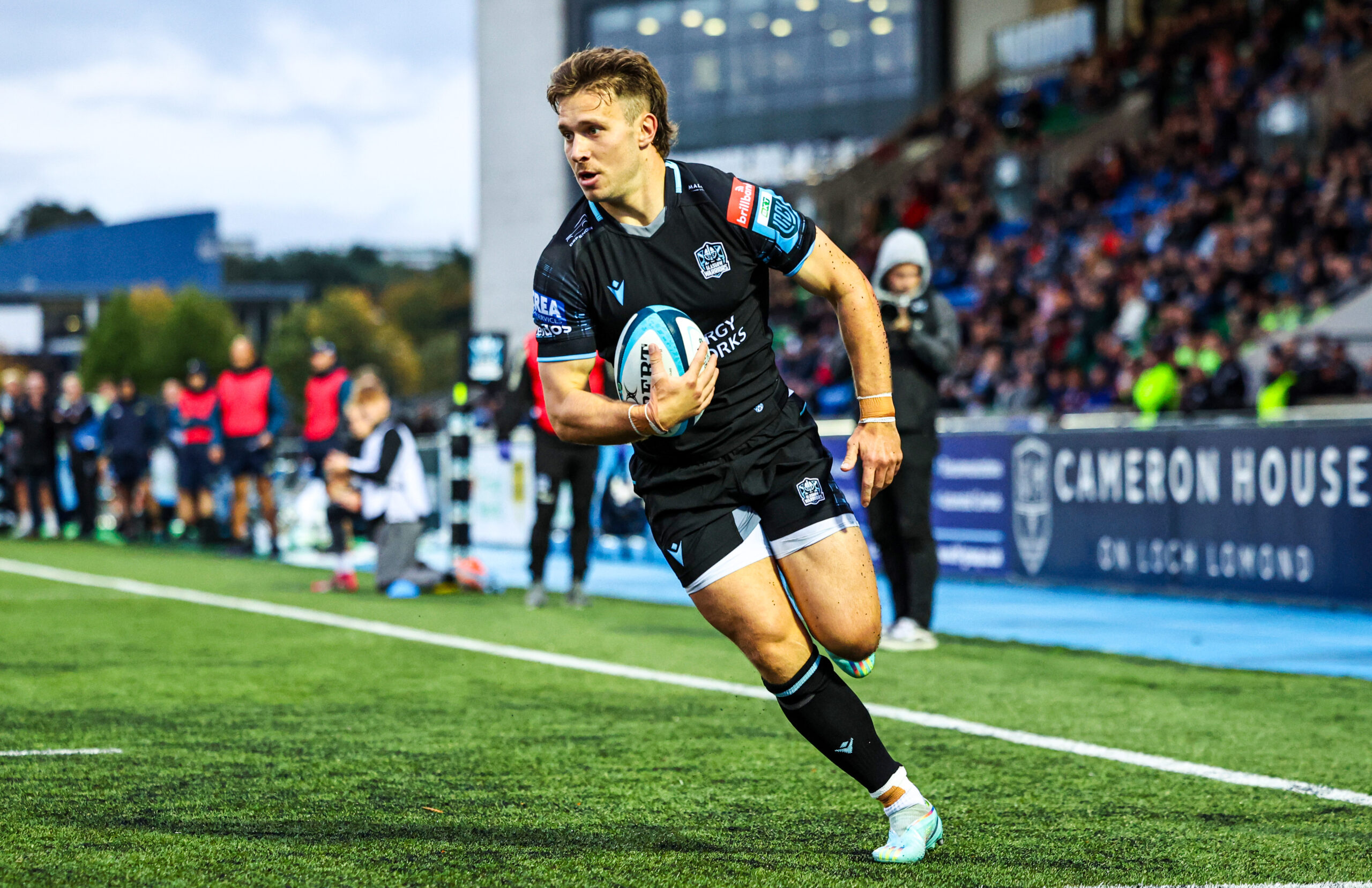 GLASGOW, SCOTLAND - SEPTEMBER 30: Warriors' Kyle Rowe scores a try during a pre-season friendly between Glasgow Warriors and Zebre Parma at Scotstoun Stadium, on September 30, 2023, in Glasgow, Scotland. (Photo by Ross MacDonald / SNS Group)