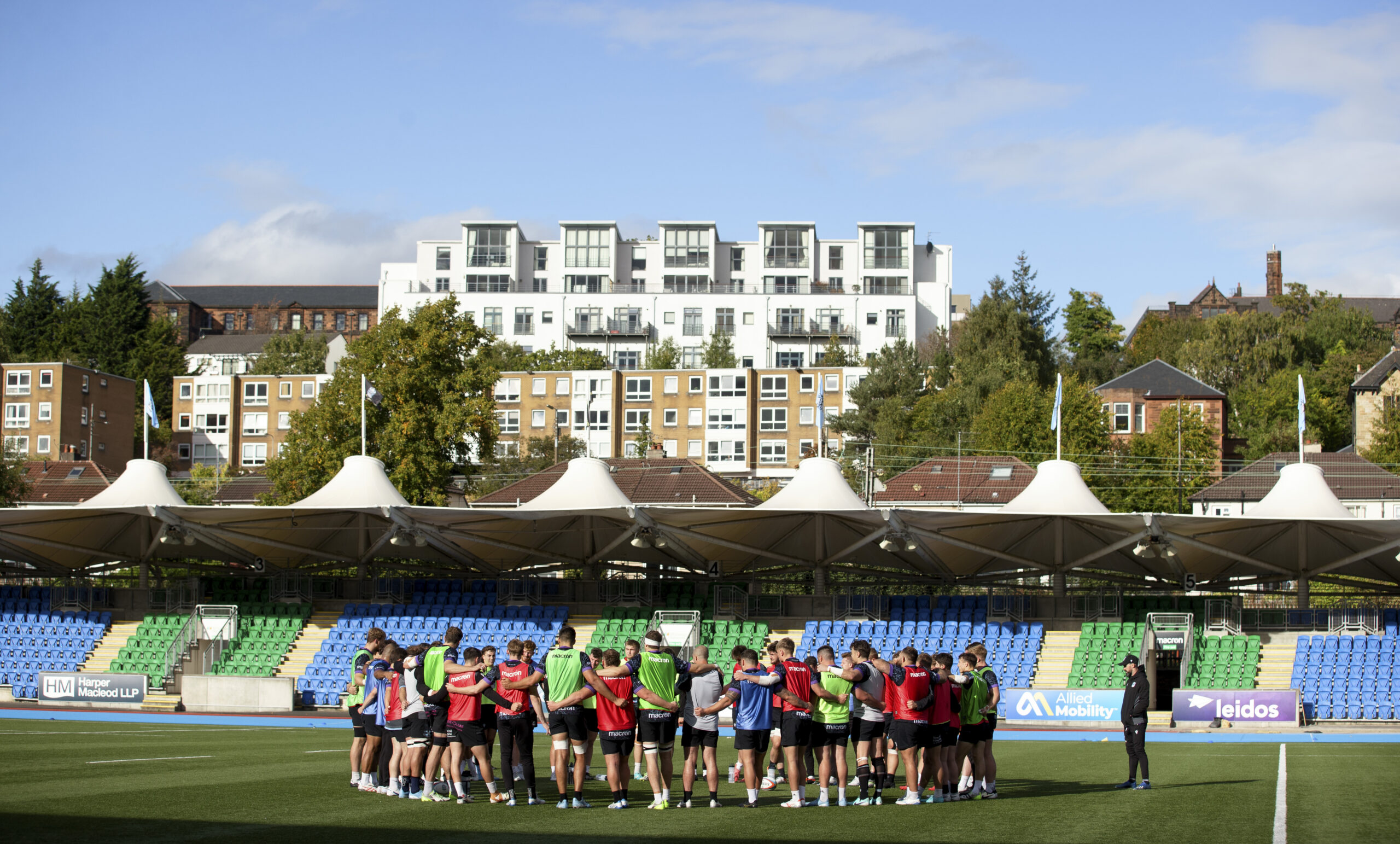 GLASGOW, SCOTLAND - SEPTEMBER 24: The Glasgow Warriors squad in a huddle during a Glasgow Warriors training session at Scotstoun Stadium, on September 24, 2024, in Glasgow, Scotland. (Photo by Craig Williamson / SNS Group)