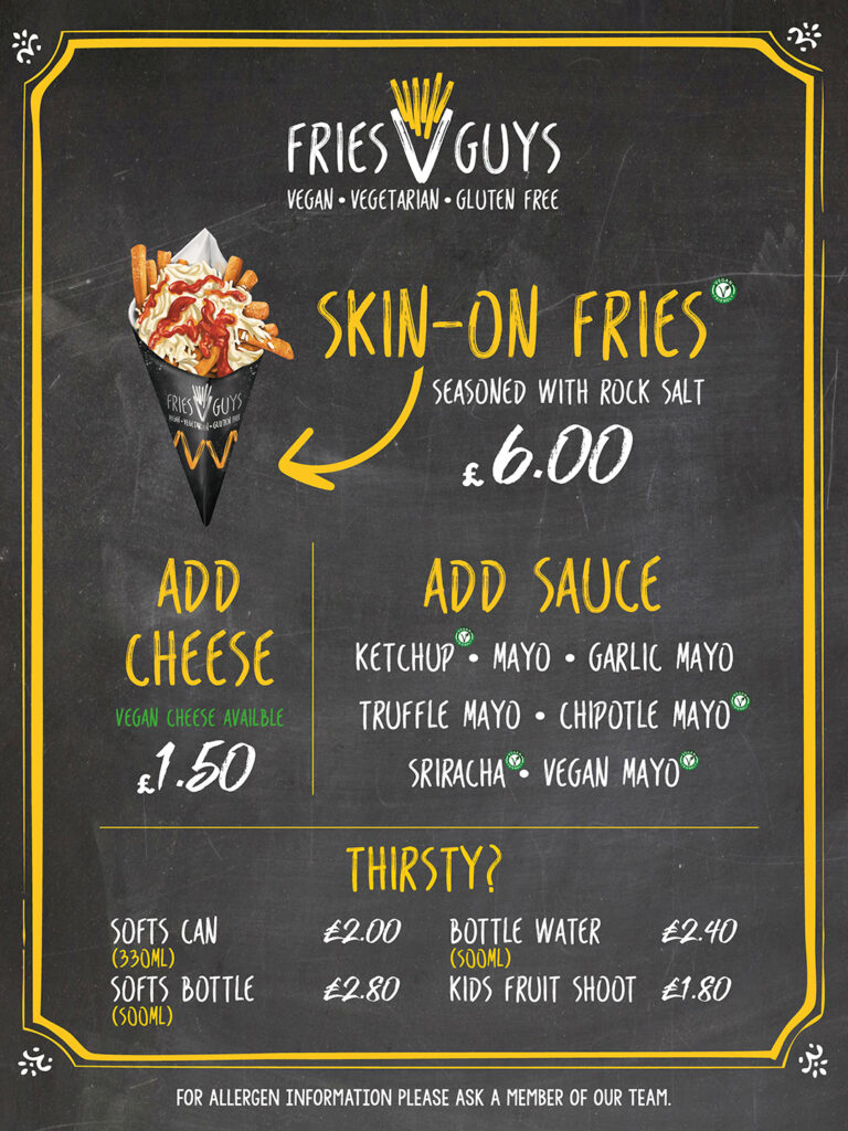 Fries fans can keep it simple with Skin-on Fries, upgrade to Cheesy Fries, or go all in with the Burger & Fries Meal Deal. They also sell a selection of soft drinks and water to keep fans refreshed.
