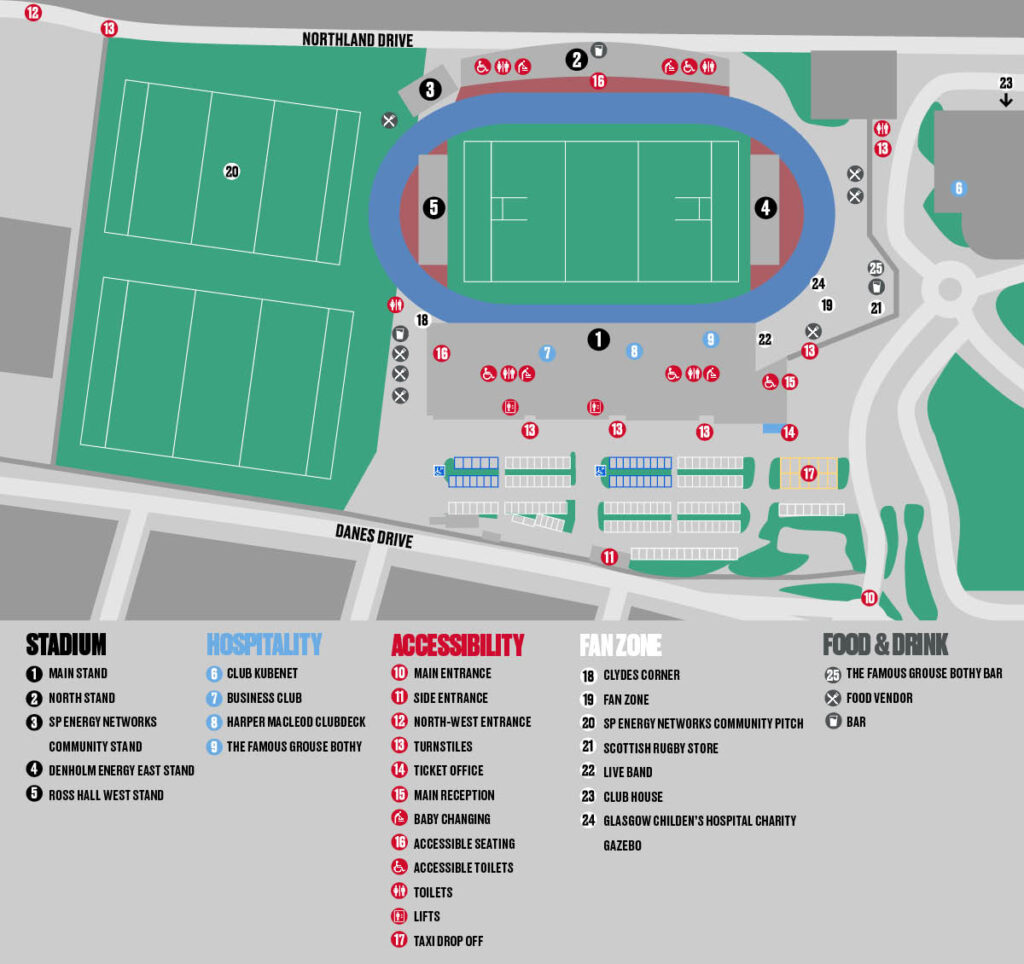 If you feel unwell during your visit to Scotstoun Stadium, please inform the nearest steward. A first aid facility is available at the south east corner of the stadium.