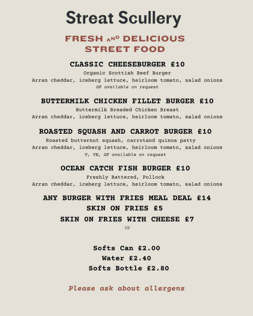 Streat Scullery return to serve up a burger menu that’s all about bold flavour and top-quality Scottish produce. Using organic grass-fed beef, free-range chicken, and freshly caught fish, every burger is crafted with care and finished with local touches like Arran cheddar and Blackthorn salt.